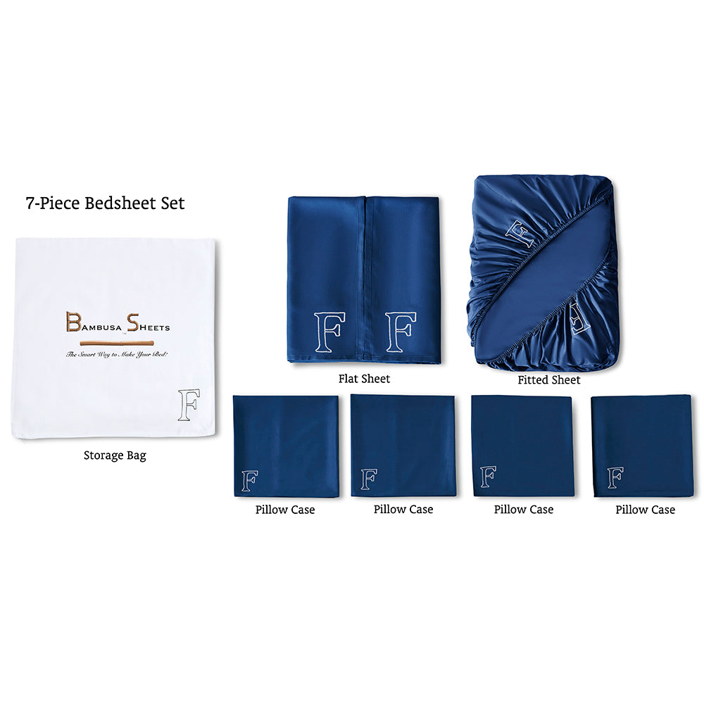 Our 7 piece embroidered bamboo bedsheet set includes: 1-fitted sheet, 1-flat sheet, 4-pillow cases, and a storage bag.